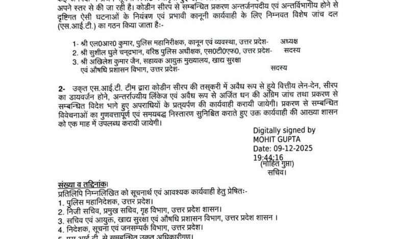 कोडिंग सिरप से संबंधित प्रकरण अंतर्जनपदी एवं अंतर विभागीय होने से दृष्टिगत ऐसी घटनाओं के नियंत्रण एवं प्रभावी कानूनी कार्यवाही के लिए विशेष जांच दल का किया गया गठन